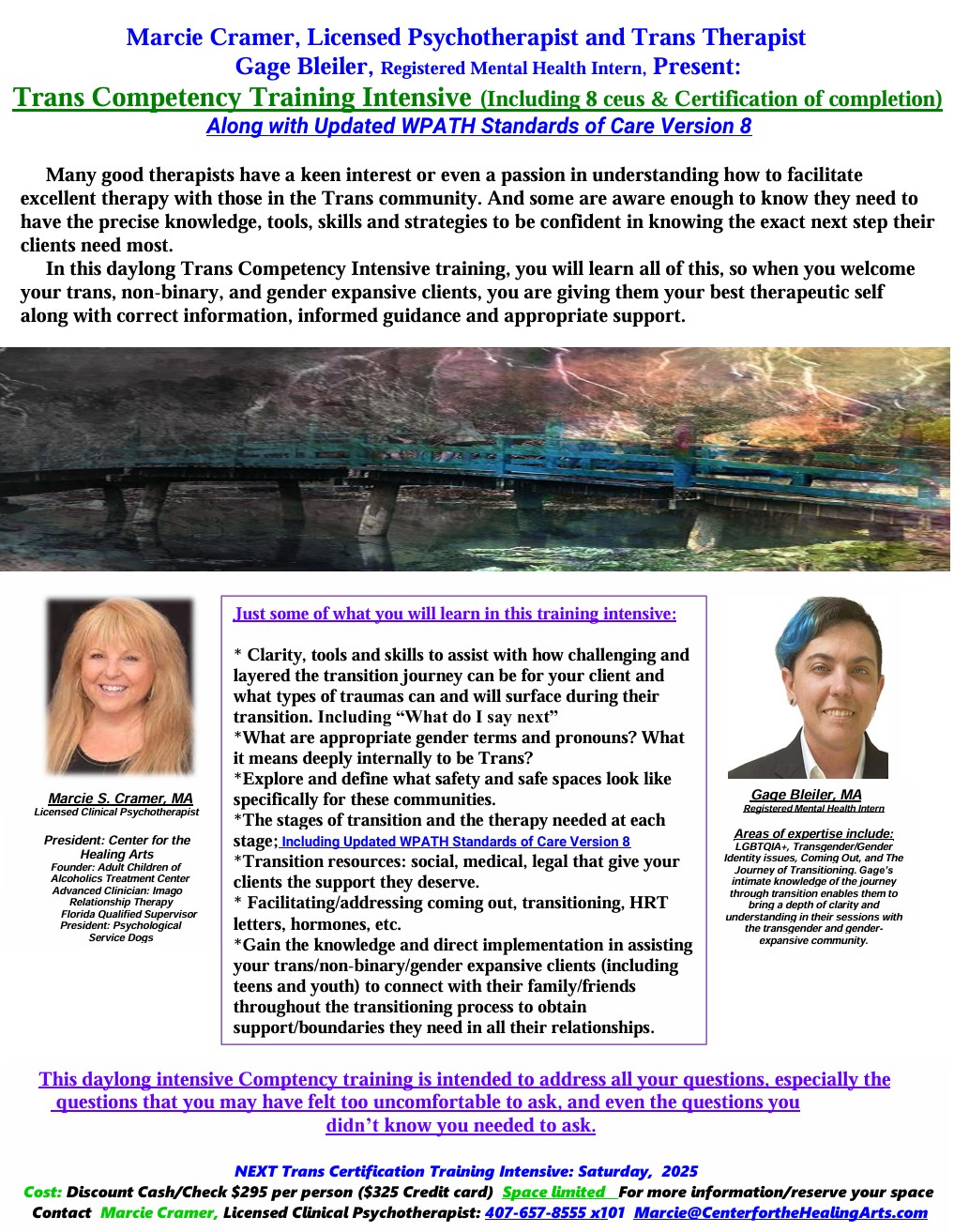 Trans Competency Certification Training Intensive Posted on March 4, 2023January 13, 2025 Download the PDF Here Next Workshop - 2/22/25 Workshop Registration Workshop Registration All workshops are $295 and require pre-registration. "*" indicates required fields URLThis field is for validation purposes and should be left unchanged.Workshops for 2025Currently scheduled workshops are all held at the Center for Healing Arts unless otherwise noted. 1908 Howell Branch Rd. Winter Park, FL 32792 (407) 657-8555 * ACoA: Childhood Interrupted: Daylong Intensive * Intro: Exploring your Unconscious, Yourself & Your Relationships * Adv: Embracing the Shadow * Qualified Supervisor Training * The Hidden Trauma of Veterinary Medicine * Healing Trauma in the LGBTQ+ Community * Treating Borderline Personality Disorder *** All published fees for workshops include our 5% discount for cash or checks. You are more than welcome to use a credit card but then the 5% discount goes away and the cost will revert to the non- discounted amount (which is 5% higher).Choose a Workshop ****Register for one of the following:ACOA: Childhood Interrupted (Daylong Intensive)Intro: Exploring your Unconscious, Yourself & Your RelationshipsAdv: Embracing the ShadowHealing Trauma in the LGBTQ+ CommunityThe Hidden Trauma of Veterinary MedicineQualified Supervisor TrainingNOTE: all fees above include our 5% discount for cash or checks! Please call the office to complete purchase.Name* First Last Email* Enter Email Confirm Email Phone*Address Street Address Address Line 2 City State / Province / Region ZIP / Postal Code AfghanistanAlbaniaAlgeriaAmerican SamoaAndorraAngolaAnguillaAntarcticaAntigua and BarbudaArgentinaArmeniaArubaAustraliaAustriaAzerbaijanBahamasBahrainBangladeshBarbadosBelarusBelgiumBelizeBeninBermudaBhutanBoliviaBonaire, Sint Eustatius and SabaBosnia and HerzegovinaBotswanaBouvet IslandBrazilBritish Indian Ocean TerritoryBrunei DarussalamBulgariaBurkina FasoBurundiCabo VerdeCambodiaCameroonCanadaCayman IslandsCentral African RepublicChadChileChinaChristmas IslandCocos IslandsColombiaComorosCongoCongo, Democratic Republic of theCook IslandsCosta RicaCroatiaCubaCuraçaoCyprusCzechiaCôte d'IvoireDenmarkDjiboutiDominicaDominican RepublicEcuadorEgyptEl SalvadorEquatorial GuineaEritreaEstoniaEswatiniEthiopiaFalkland IslandsFaroe IslandsFijiFinlandFranceFrench GuianaFrench PolynesiaFrench Southern TerritoriesGabonGambiaGeorgiaGermanyGhanaGibraltarGreeceGreenlandGrenadaGuadeloupeGuamGuatemalaGuernseyGuineaGuinea-BissauGuyanaHaitiHeard Island and McDonald IslandsHoly SeeHondurasHong KongHungaryIcelandIndiaIndonesiaIranIraqIrelandIsle of ManIsraelItalyJamaicaJapanJerseyJordanKazakhstanKenyaKiribatiKorea, Democratic People's Republic ofKorea, Republic ofKuwaitKyrgyzstanLao People's Democratic RepublicLatviaLebanonLesothoLiberiaLibyaLiechtensteinLithuaniaLuxembourgMacaoMadagascarMalawiMalaysiaMaldivesMaliMaltaMarshall IslandsMartiniqueMauritaniaMauritiusMayotteMexicoMicronesiaMoldovaMonacoMongoliaMontenegroMontserratMoroccoMozambiqueMyanmarNamibiaNauruNepalNetherlandsNew CaledoniaNew ZealandNicaraguaNigerNigeriaNiueNorfolk IslandNorth MacedoniaNorthern Mariana IslandsNorwayOmanPakistanPalauPalestine, State ofPanamaPapua New GuineaParaguayPeruPhilippinesPitcairnPolandPortugalPuerto RicoQatarRomaniaRussian FederationRwandaRéunionSaint BarthélemySaint Helena, Ascension and Tristan da CunhaSaint Kitts and NevisSaint LuciaSaint MartinSaint Pierre and MiquelonSaint Vincent and the GrenadinesSamoaSan MarinoSao Tome and PrincipeSaudi ArabiaSenegalSerbiaSeychellesSierra LeoneSingaporeSint MaartenSlovakiaSloveniaSolomon IslandsSomaliaSouth AfricaSouth Georgia and the South Sandwich IslandsSouth SudanSpainSri LankaSudanSurinameSvalbard and Jan MayenSwedenSwitzerlandSyria Arab RepublicTaiwanTajikistanTanzania, the United Republic ofThailandTimor-LesteTogoTokelauTongaTrinidad and TobagoTunisiaTurkmenistanTurks and Caicos IslandsTuvaluTürkiyeUS Minor Outlying IslandsUgandaUkraineUnited Arab EmiratesUnited KingdomUnited StatesUruguayUzbekistanVanuatuVenezuelaViet NamVirgin Islands, BritishVirgin Islands, U.S.Wallis and FutunaWestern SaharaYemenZambiaZimbabweÅland Islands Country Total How did you hear about us?*CAPTCHA